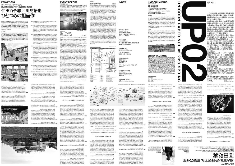 円錐会では、横浜国立大学建築学科出身の建築に関わる、様々な世代の活動の模様を一枚の紙の上に展開した会報誌、UNICORN PAPERを発行しています。