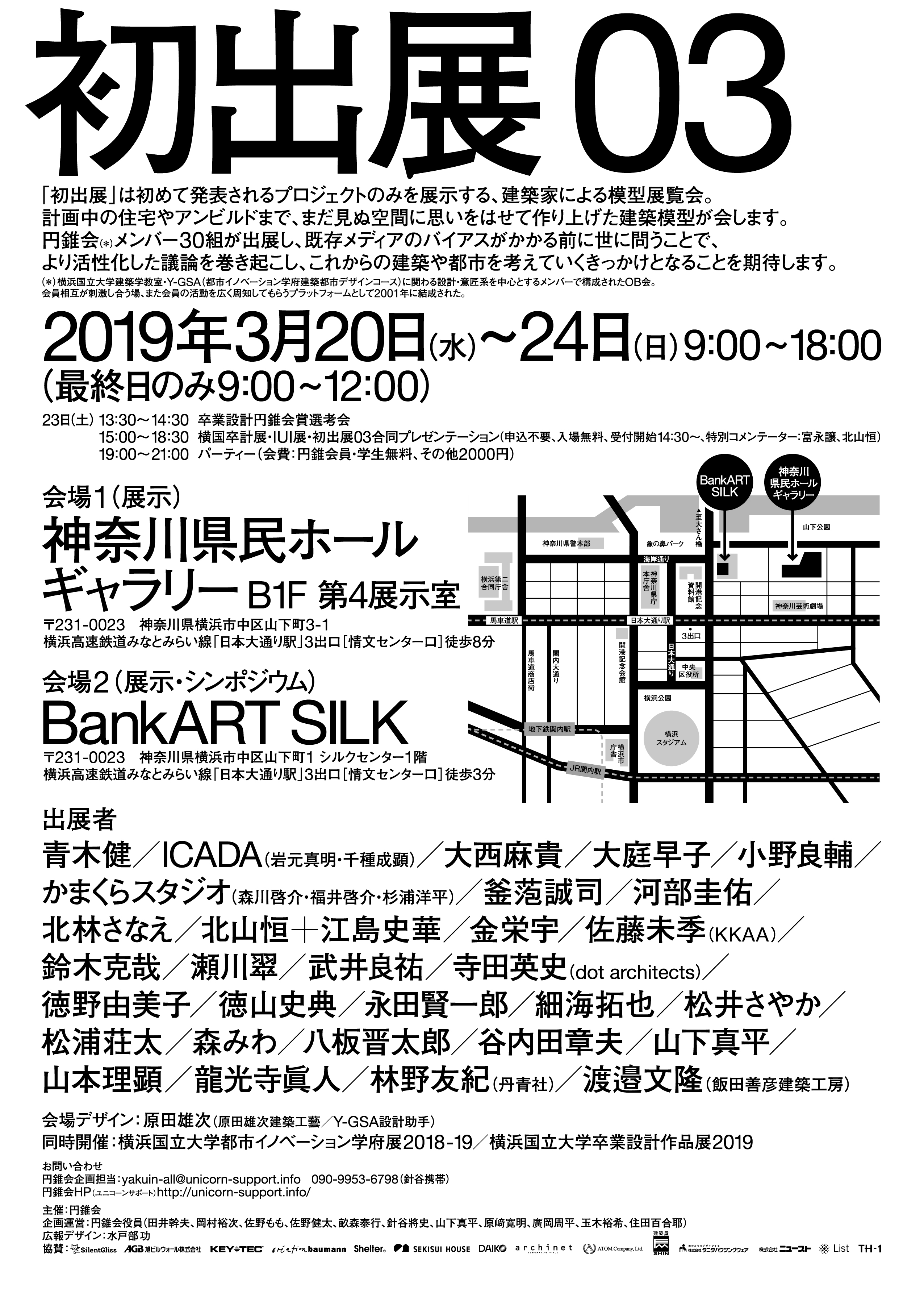 円錐会では昨年に引き続き横浜国立大学の卒業制作展、横浜国立大学都市イノベーション学府展(IUI展)の日程に合わせて「初出展03」を開催します。「初出展」とは初めて発表されるプロジェクトのみを展示する、円錐会会員による模型展覧会で、今回で3回目となりました。